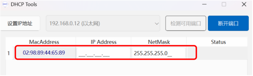 ②、将森特奈 ModbusTCP 协议 IO-LINK 主站模块与电脑连接,然后将模块 IP 地址设置 拨码拨到“0XFF” (窗口右侧 ADDR_H 拨到 F,ADDR_L 拨到 F,可参考说明书),即“DHCP 模式,上电一直等待分配 IP”。拨完后,模块需要重新上电,此时,模块 BUS 红灯将闪烁。然后点击软件中“检测可用端口”,找到本地端口,然后点击“连接端口”