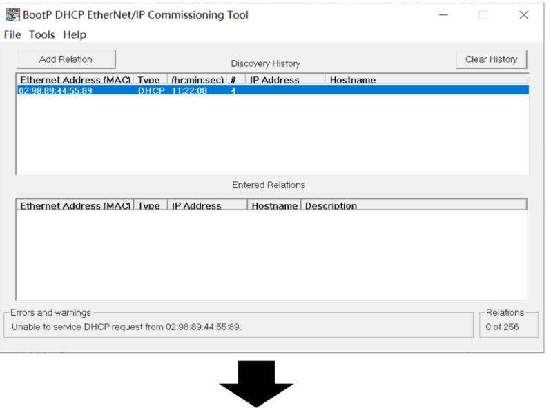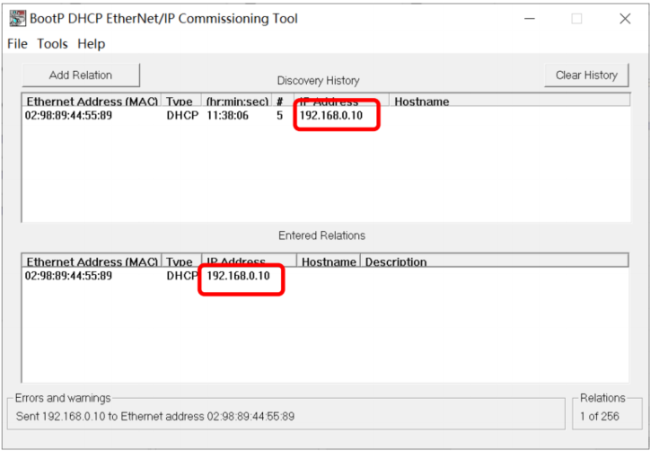 方法二:可以通过第三方设置软件进行 IP 地址设置。 ①、本例中使用 AB 的“Bootp-DHCP Tool”软件,设置之前,先将模块 IP 地址设置拨码(窗口右侧 ADDR_H,ADDR_L,可参考说明书)拨到“0XFF”,即“DHCP 模式,上电一直等待分配 IP”。拨完后,模块需要重新上电,此时,模块 BUS 红灯将闪烁。打开该软件,选择本机相应网卡,点击“OK”。