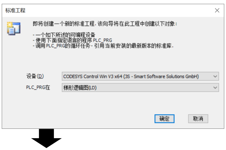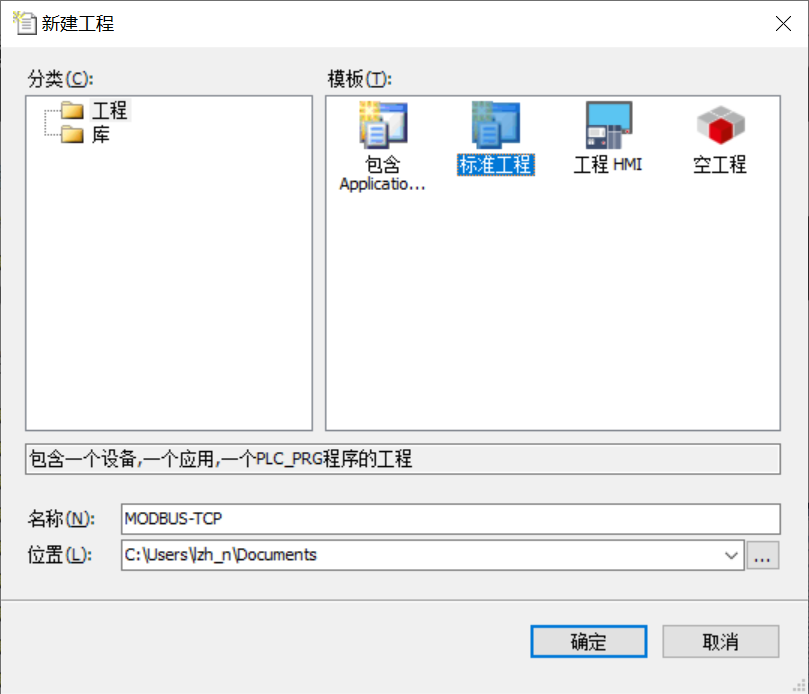 2、打开 CODESYS 软件,新建一个标准工程,新建一个标准工程,自定义一个“名称”,点击“确定”。