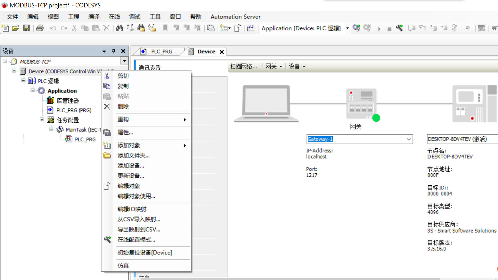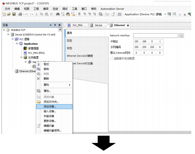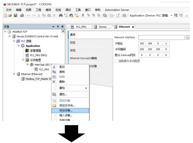 CODESYS 主站 IP 需和从站模块 IP 在同一网段内 8、添加 Modbus TCP Master 与 Modbus TCP Slave