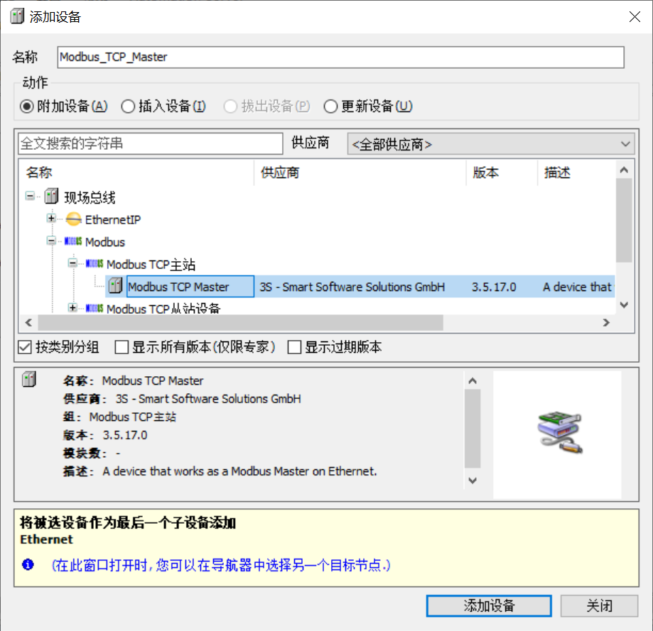 2. 选择 Modbus TCP 主站下的 Modbus TCP Master(不同版本可能显示 Mobus TCP Client),点击“添加设备”