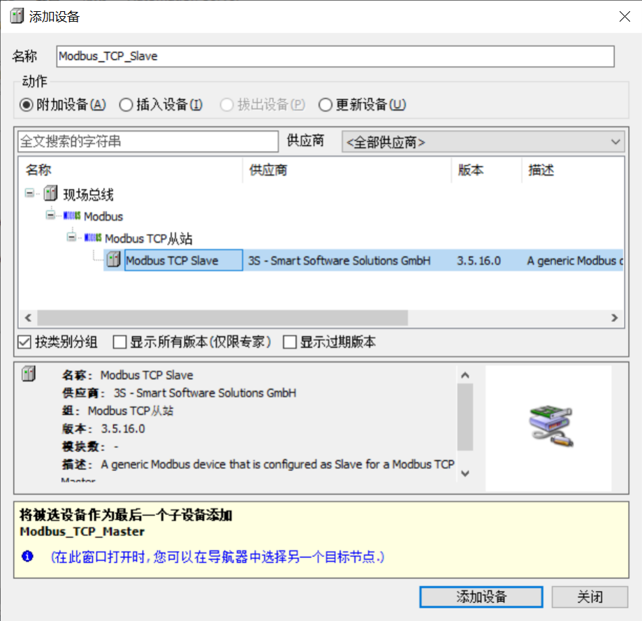 右键左侧导航树 Modbus TCP Master → “添加设备” → 选择 Modbus TCP 从站下的 Modbus TCP Slave → “添加设备”。