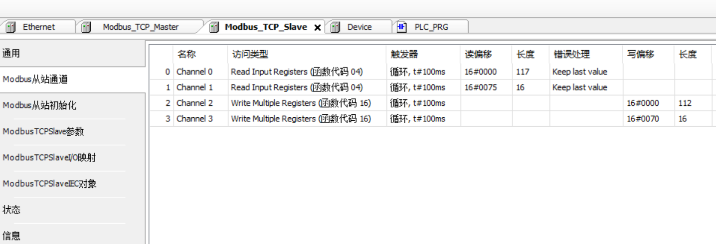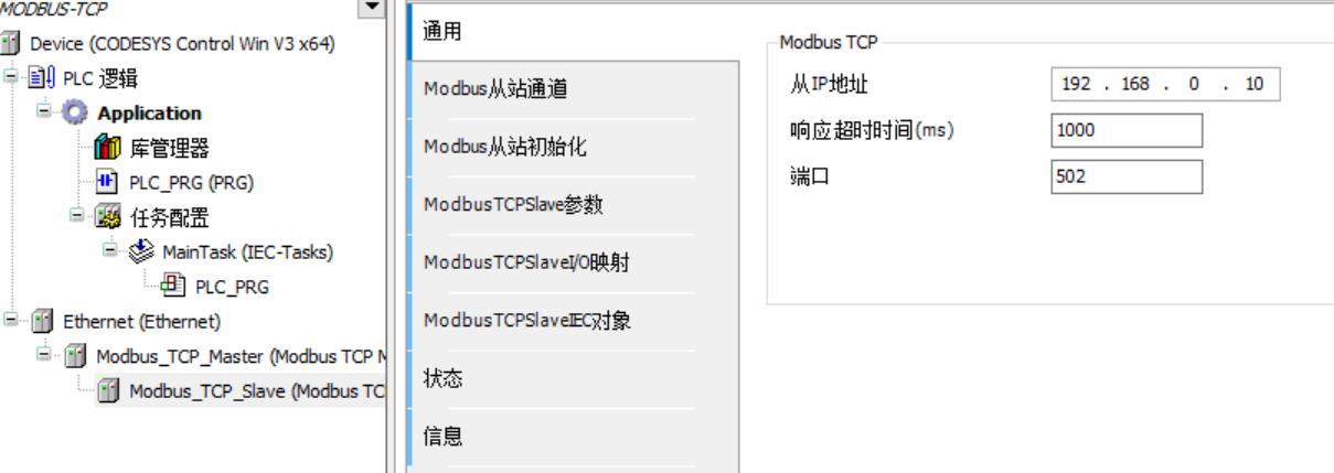 双击左侧导航树 Modbus TCP Slave,右侧主菜单点击“通用”,设置参数: