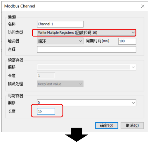 • Channel3:功能码 F16,偏移 112,长度 16(写入第八个端口的输出数据)