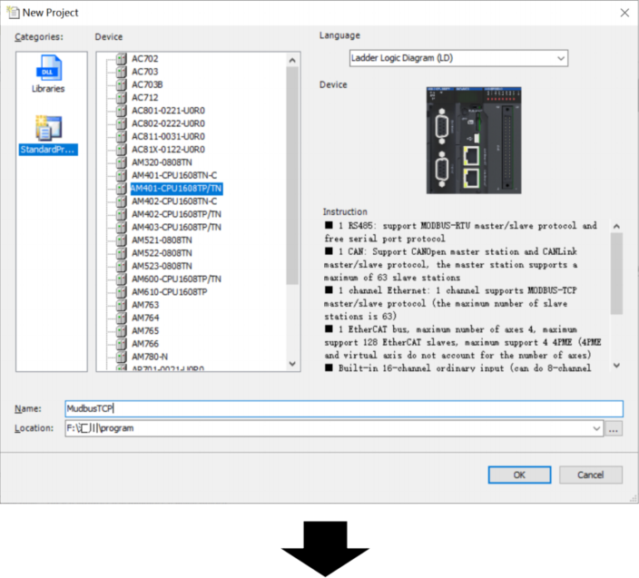 2、打开InoProShop软件(本例中版本为V1.8.1.1),新建一个标准工程,选择相应的PLC,自定义一个“名称”。点击“OK”。