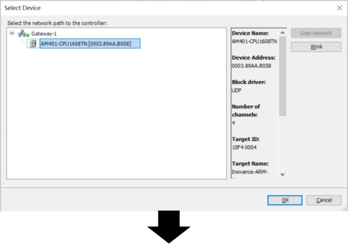 3、下面要进行控制器联机,双击“Device(AM401-CPU1608TP/TN),最右侧可以看到PLC图标位置是黑色小点,说明未联机。点击中间“Scan Network...”,并在弹出的对话框中选择“AM401-CPU1608TN【0003.89AA.B058】”,然后点击‘OK’。此时可以看到PLC位置黑色小点变成绿色,代表联机正常。