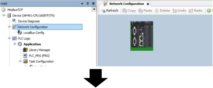 6、此时,在界面左侧视图中将出现Modbus TCP组态配置对应设备树,如下