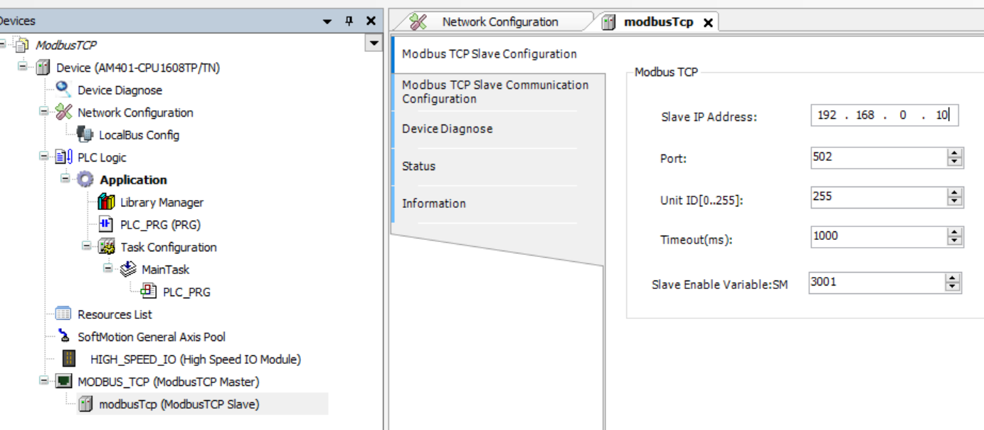 8、双击“modbusTCP(ModbusTCP Slave)”,在右侧对话框中,点击“Modbus TCP Slave Configuration”,进行从站配置。根据下图参数配置说明,填入适当的从站模块的IP地址(192.168.0.10)、端口号(502)、从站地址(255)、超时时间(1000)、从站使能变量(SM3001)
