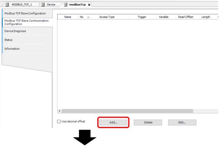 9、然后点击“Modbus TCP Slave Communication Configuration”进行从站通讯设置,点击“Add...”添加通道,每一个通道代表一个独立的Modbus TCP请求