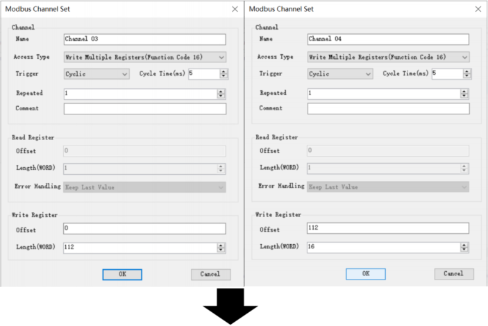 - Channel04,设置为F16功能码,“offset”偏移选择“112”,“Length”长度“16”,表示写入第八个端口的输出数据