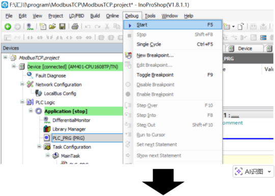 11、将从站使能变量SM3001置1(可在程序中设置),然后点击“Online”---“Login”,然后点击“Debug”---“Start”