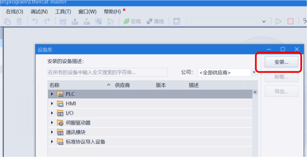 安装 EtherCAT 模块的 ESI 文件:菜单“工具” → “设备库” → “安装”。