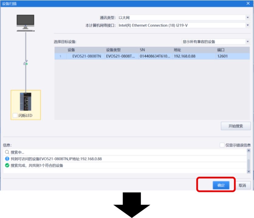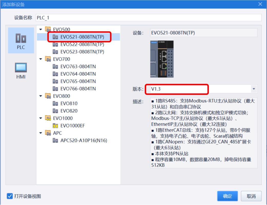 双击左侧“添加设备”,选择正确的 PLC 型号(本例为 EVO521-0808 TP(TN),版本 V1.3),点击“确定”。