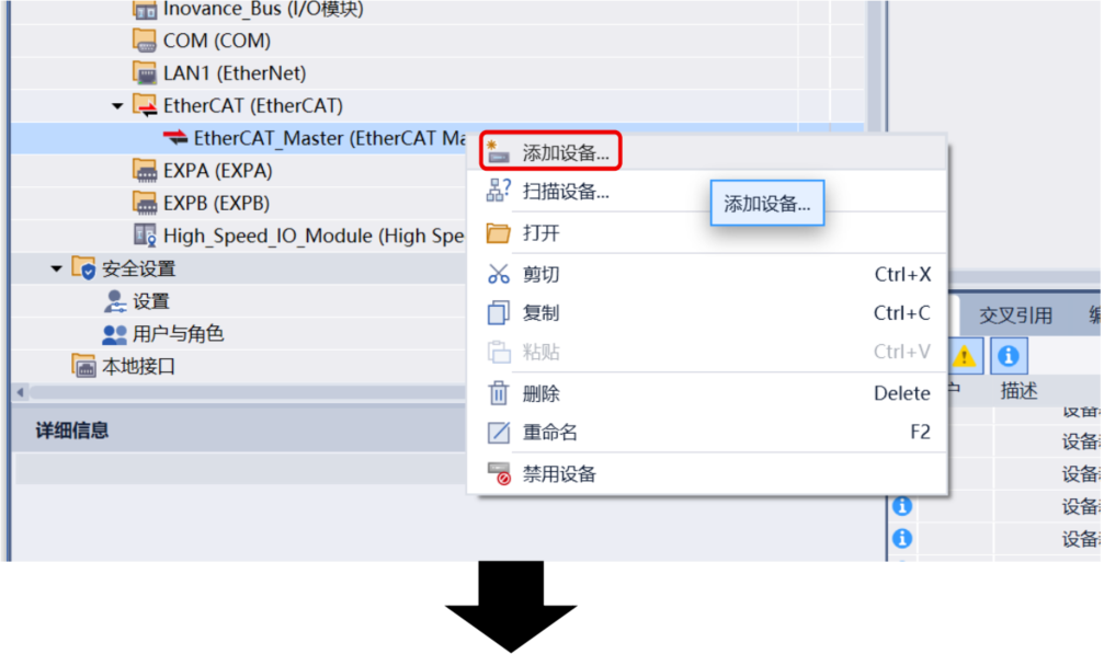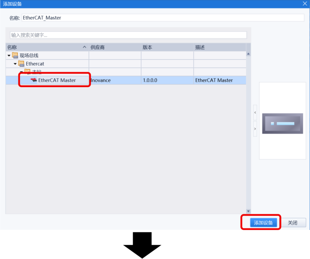 硬件配置→Ethercat(Ethercat),右键“添加设备”,选择EtherCAT master,点击“添加设备”。