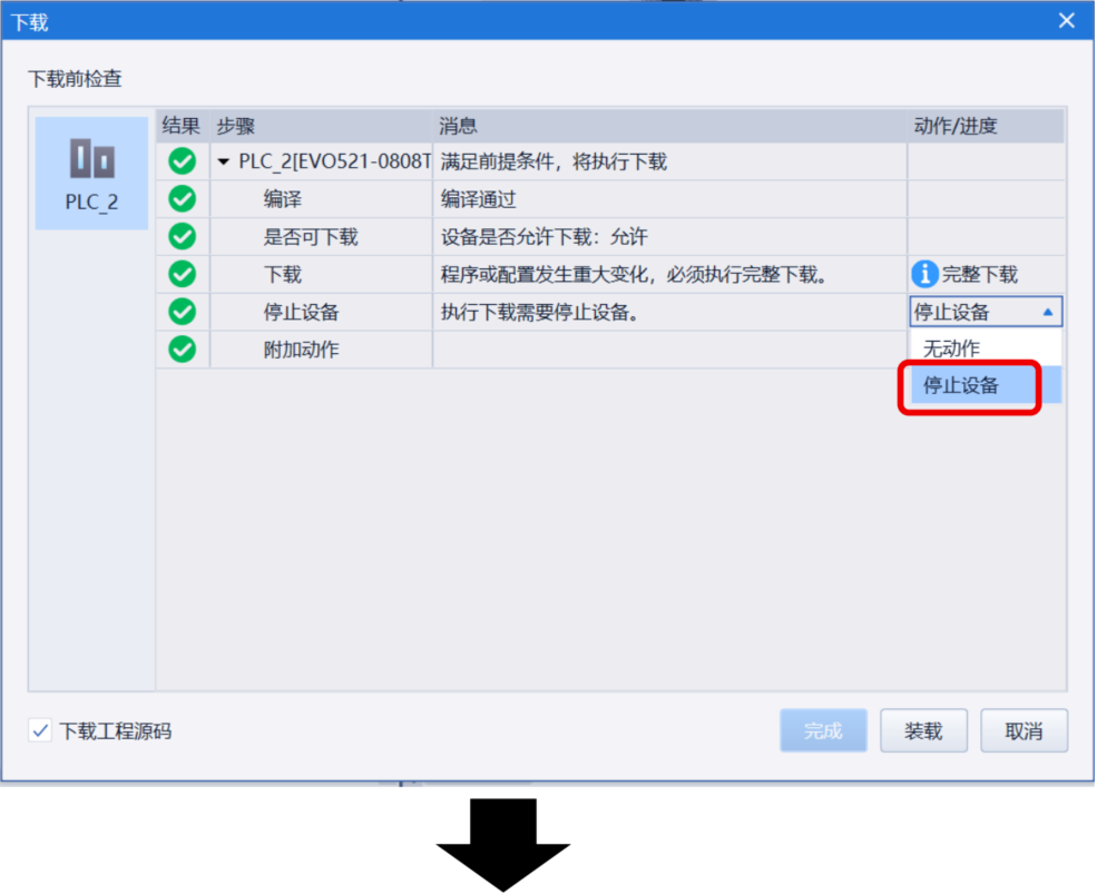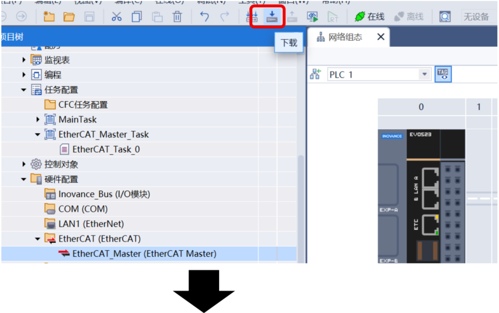 Ethercat项目下会新增Ethercat Master。此时先下载程序:点击菜单“下载”图标,完成下载步骤。