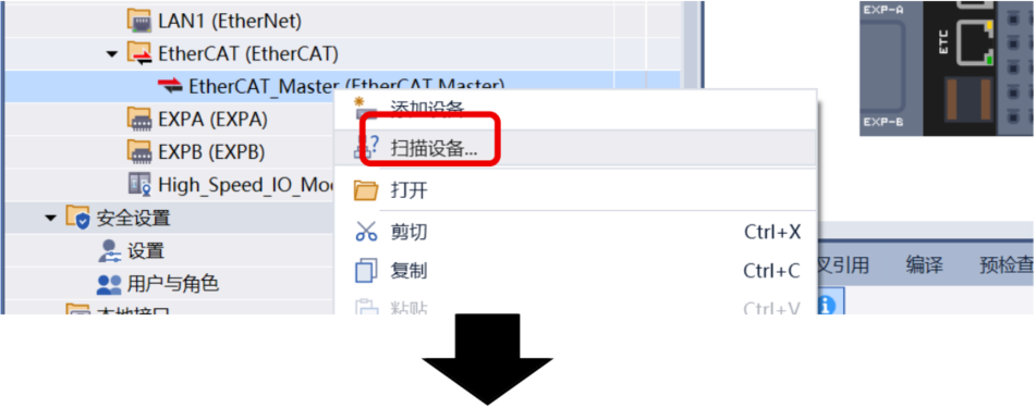 Ethercat Master→ “扫描设备”,在弹出的对话框中点击左下角“扫描设备”(按界面提示完成扫描)。