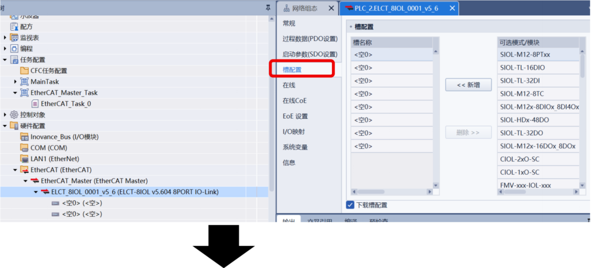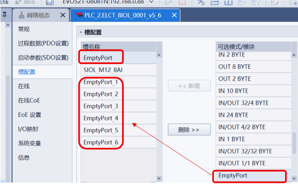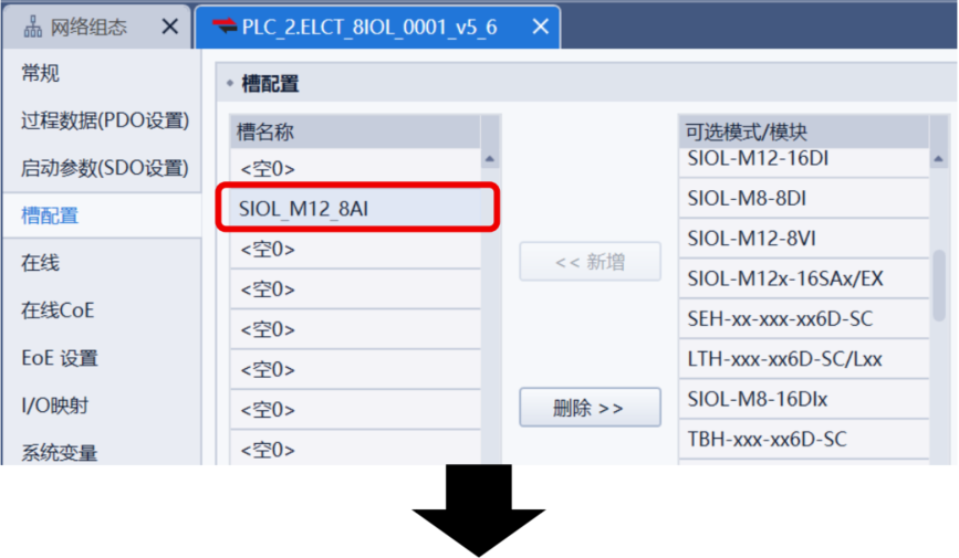 ELCT_8IOL_0001_v5_6,在右侧点击“槽配置”,将SIOL-M12-8AI添加到第 2 端口。注意: 其余<空>端口需要放入右侧的Empty Port(不得存在<空>端口)。