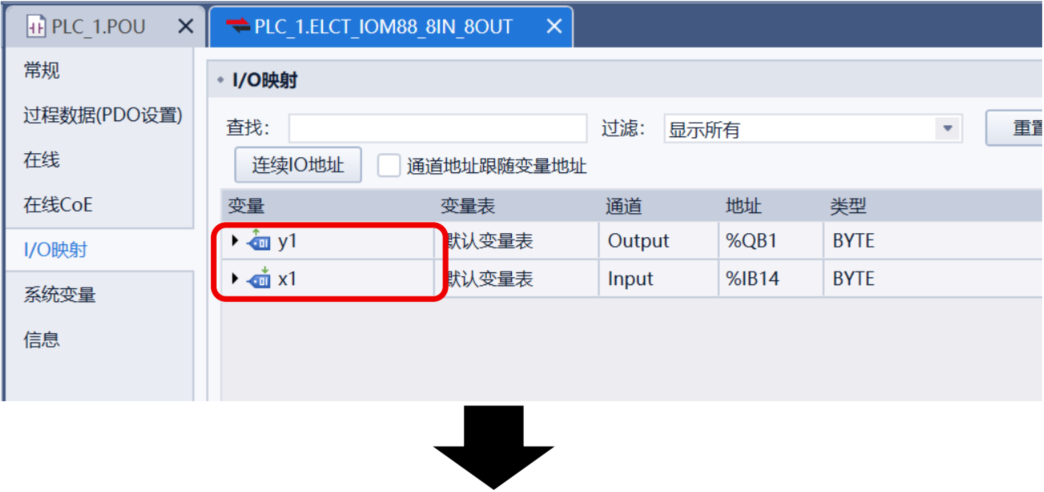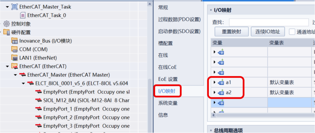 ELCT_8IOL_0001_v5_6,右侧点击 “I/O 映射”,将SIOL-M12-8AI子站第 1 个端口的 2 个字节映射到字节变量a1、a2;a1、a2组合后即为端口 1 的模拟量输入数据。