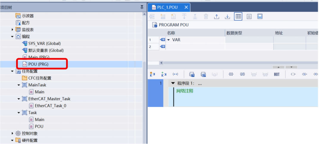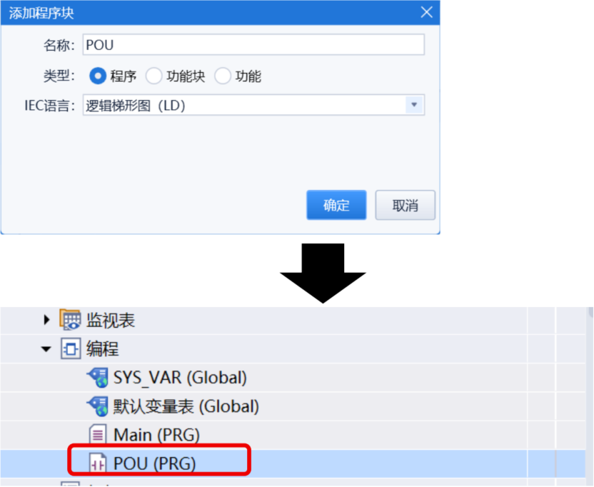 点击“确定”,左侧将生成新的 POU(