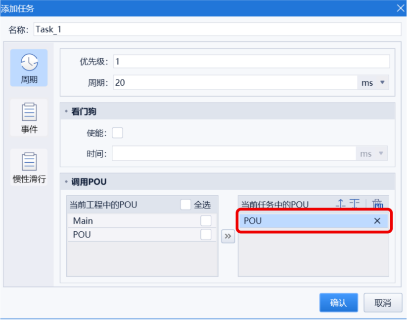 POU放入“当前任务中的 POU”,点击“确认”。