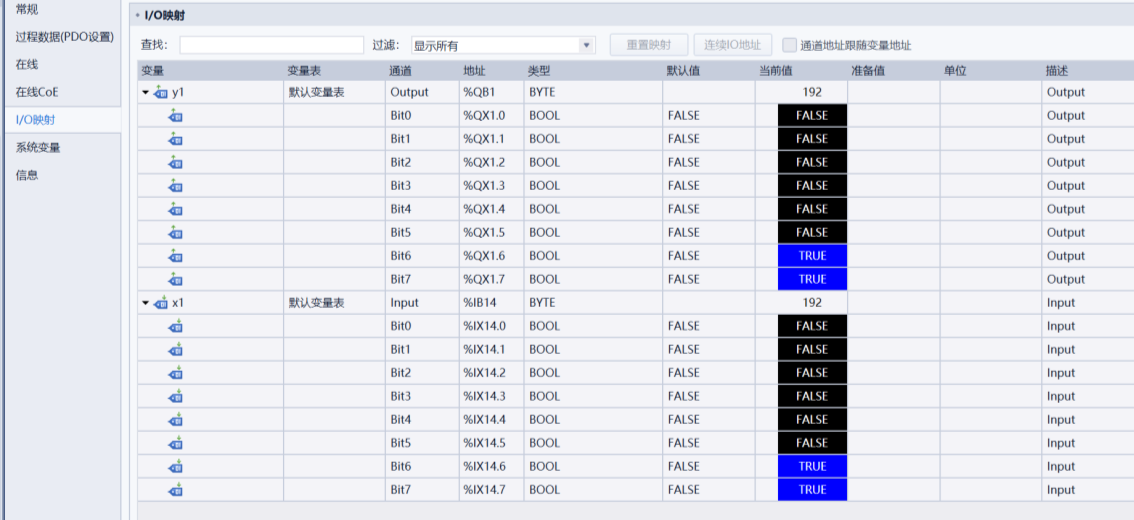 示例(IOM88 远程模块):先给输入字节和输出字节分别映射一个字节类型