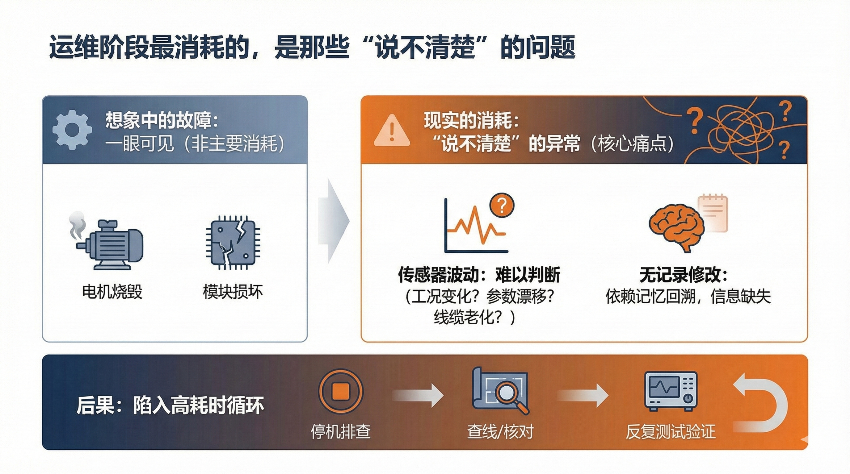 和想象中不同,运维阶段最耗精力的,通常不是电机烧毁、模块损坏这类一眼 可见的大故障,而是一些“说不清楚”的异常:设备运行了几个月,某一路传感器开始出现波动,却难以判断是工况变化、参数漂移,还是线缆老化带来的偶发干扰;又或者,调试阶段做过多次临时修改,但相关信息没有被完整记录,真正需要回溯时只能依赖现场人员的记忆。
