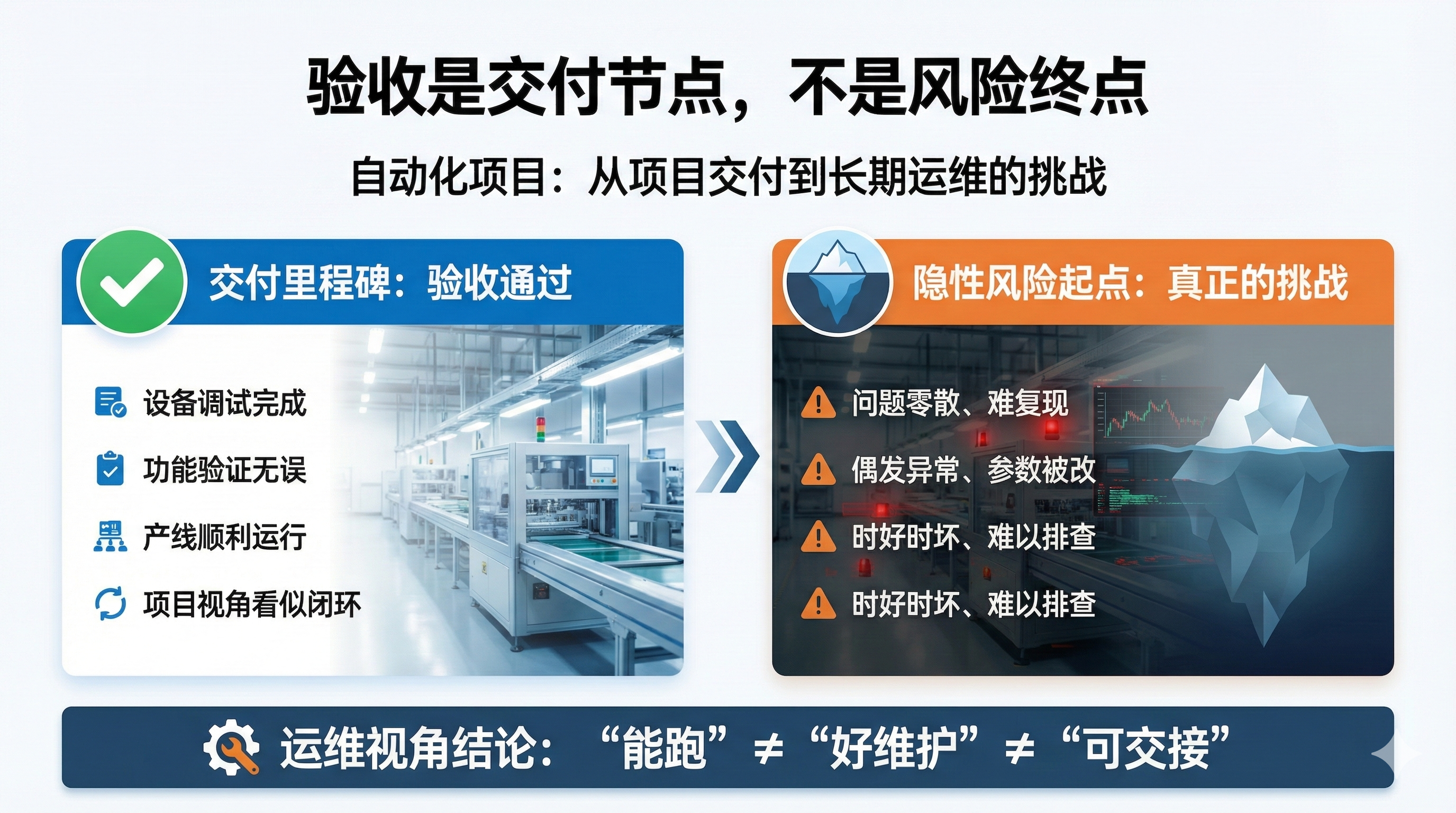 在自动化项目里,“验收通过”常被视为一个重要里程碑:设备调试完成、功能验证无误、产线顺利运行,从项目管理角度看,交付似乎已经闭环。但在很多真实现场,真正的挑战往往从这一刻开始。